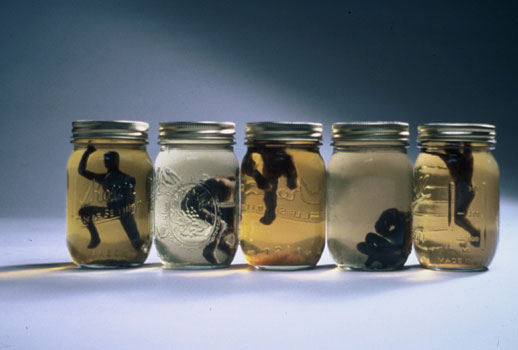 There are about 30 jars total that can be stacked and arranged any number of ways.